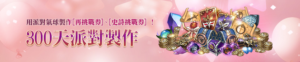 | 藍色派對氣球 x20 | - | - | 300天派對邀請函(活動) x1 | 每帳號 6次 | 使用期間:至6月17日8:00為止 |