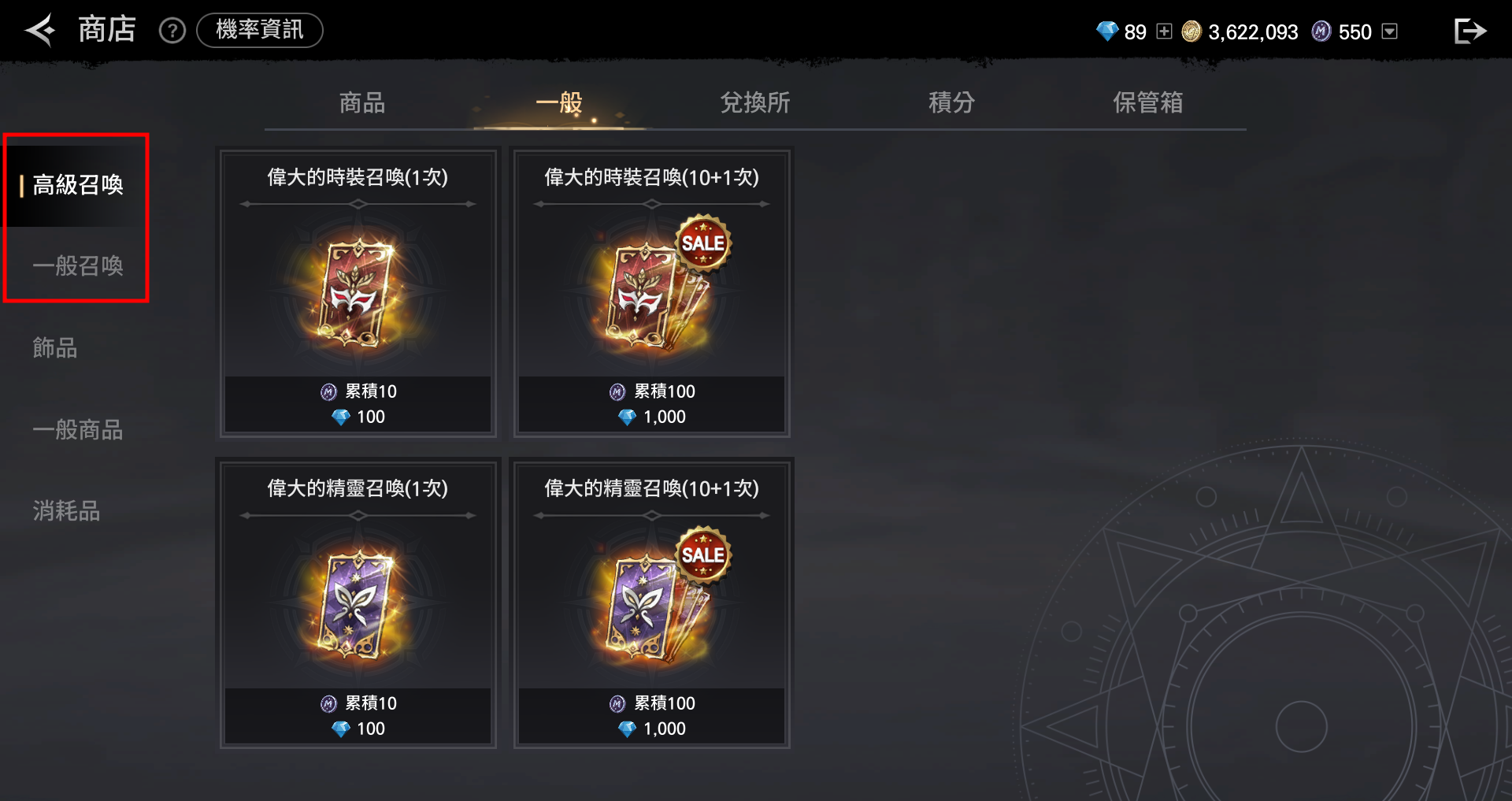 -在[高級]頁籤中可使用鑽石來召喚;在[金幣]頁籤中可使用金幣來召喚。