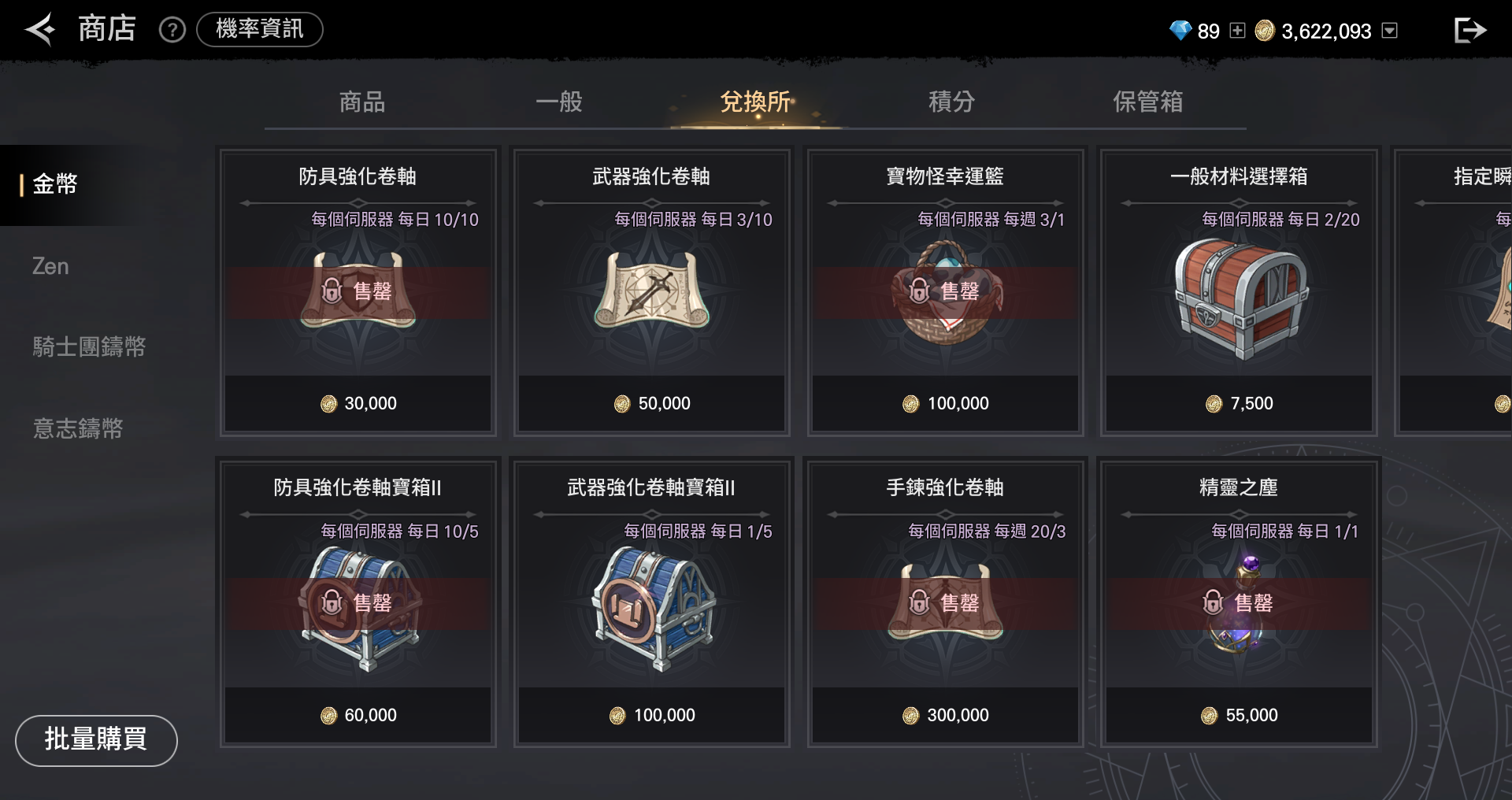 -可於兌換所頁面中,使用金幣、Zen、騎士團鑄幣來購買商品。