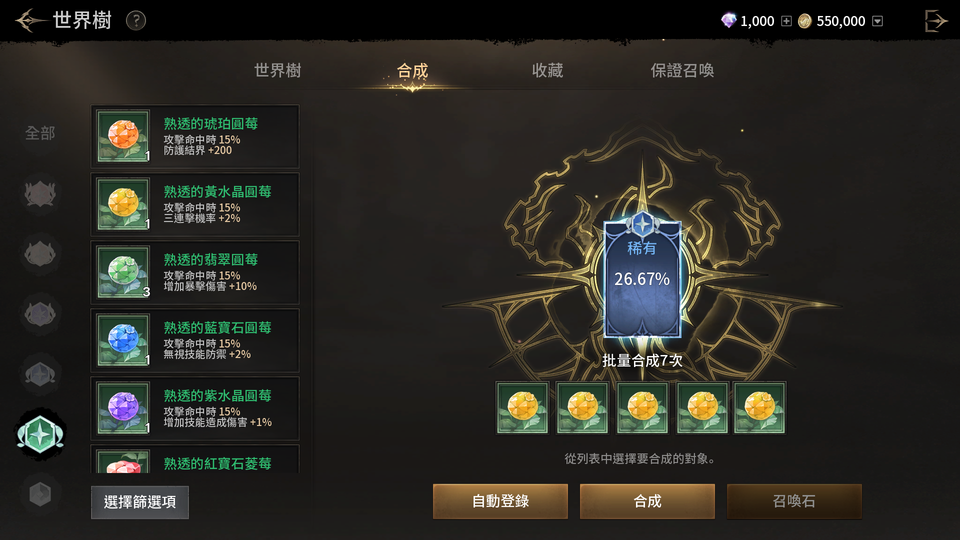 - 若合成失敗時,可獲得1個與材料相同階級的果實,以及5個世界樹果實召喚石碎片。
