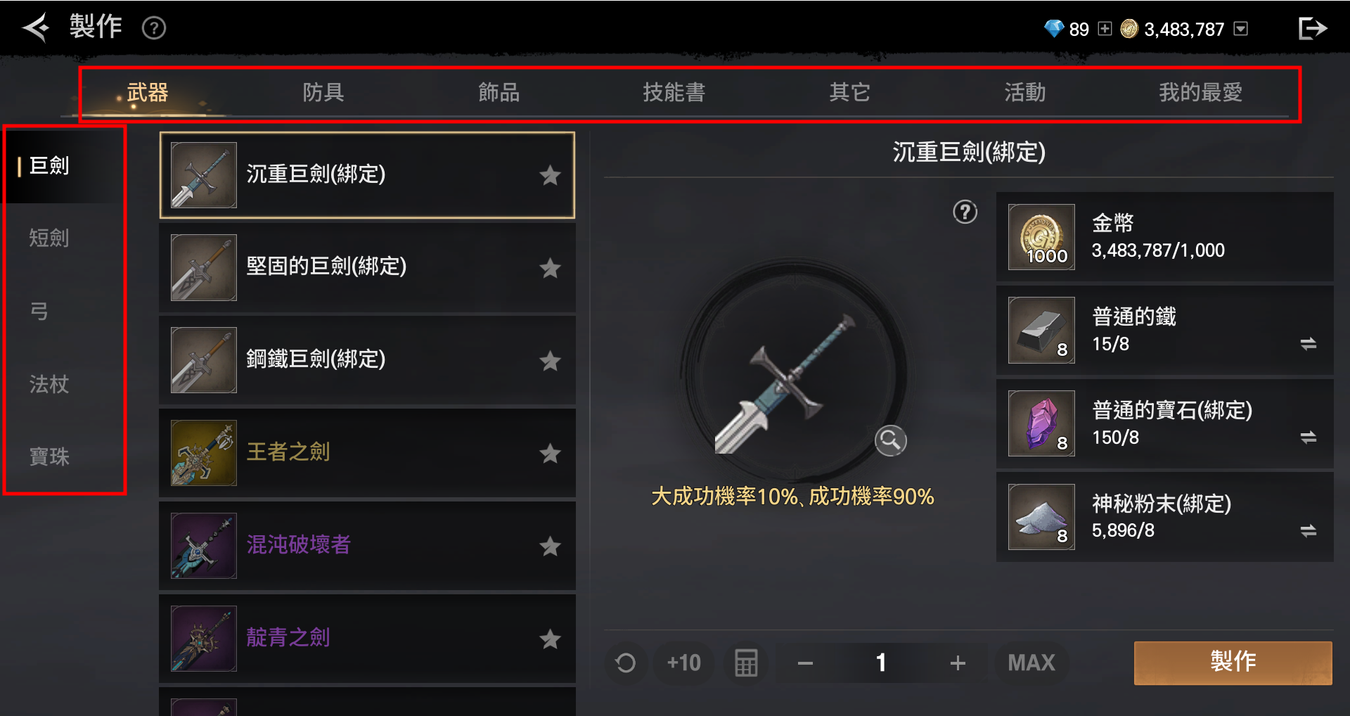 - 武器:可製作巨劍、短劍、弓、法杖、寶珠,共五種武器。