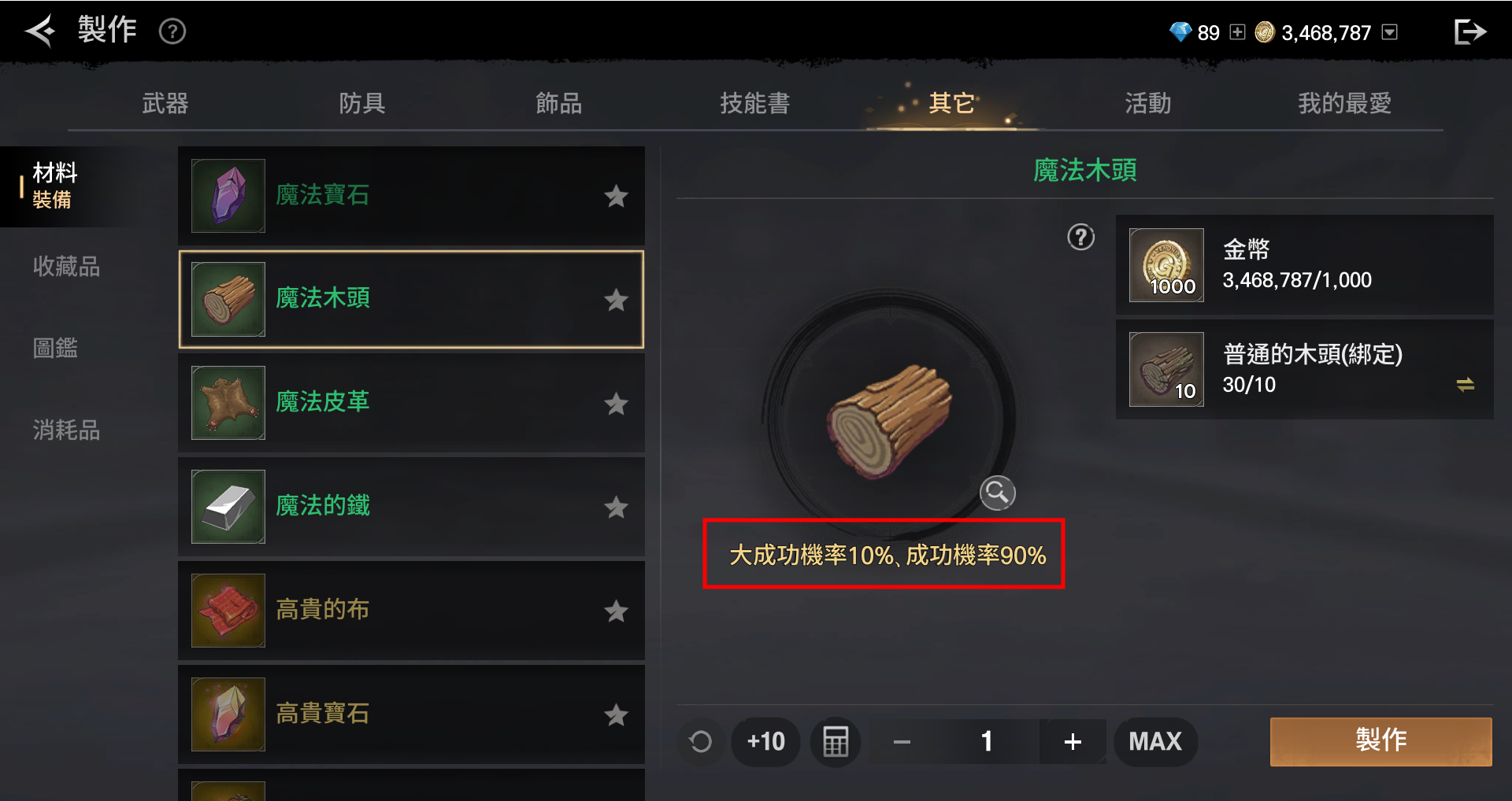 - 於左側列表中選擇想要的道具後點擊製作,即可完成製作。