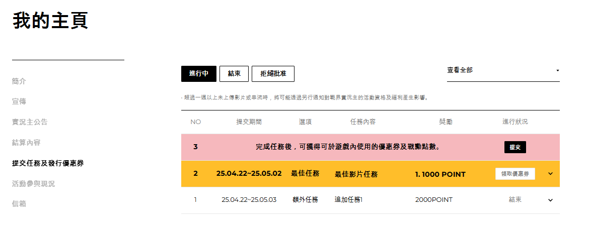 提交的任務影片通過審查時,將發放戰勳點數及優惠券作為獎勵,且該優惠券僅限實況主本人使用。
