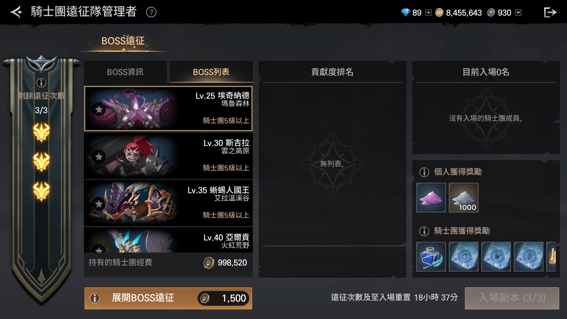 | 騎士團遠征規則 | ①BOSS遠征:以騎士團為基準,最多可進行3次。且將根據各BOSS的難度消耗騎士團經費。 ② 每週每帳號各伺服器最多可進入3次BOSS遠征地區,且次數將於每週二例行性維護後重置。 ③需於開始BOSS遠征的360分鐘內擊殺BOSS,擊殺後可獲得獎勵。 ④開始遠征後角色死亡時,可於正在進行的地圖中復活。 ⑤擊殺BOSS後,可獲得個人獎勵及騎士團獎勵。 |