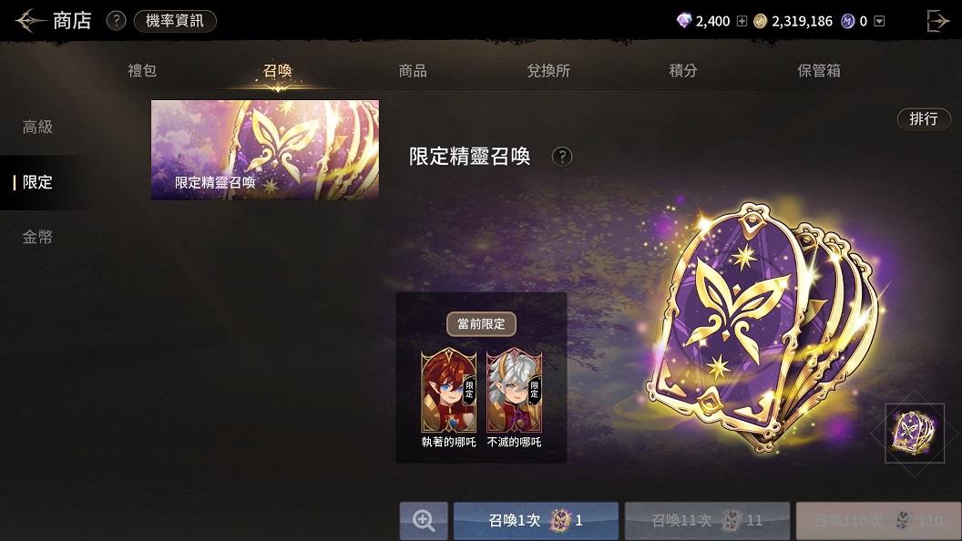 - 期間限定精靈召喚券可透過進行遊戲或購買商品獲得。