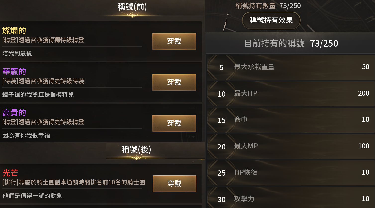 ·左邊顯示角色時裝、穿戴的裝備及能力值;右邊有自我介紹、所屬騎士團、其他玩家給你的留言和更名紀錄。