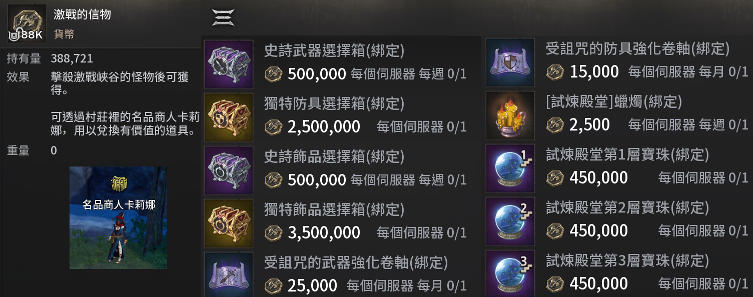 ·名品商人卡莉娜:在特殊副本的激戰峽谷打激戰信物寶箱,開出「激戰的信物」,可以在這兌換物品。