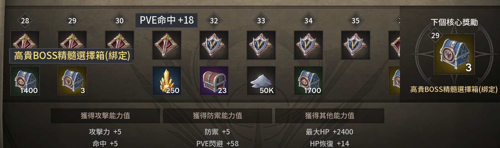 升級之後會加各種能力值,升到對應的等級就有機會得到金精髓箱。等級越高,能力值加越多。