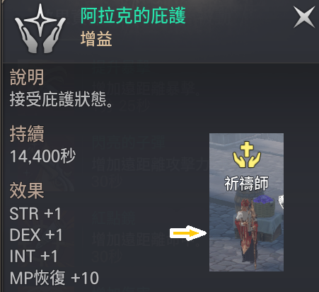 ·祈禱師:透過村莊的祈禱師來獲得增益,每次獲得增益可持續4小時,目前沒開放,以前版本曾開放過2次。