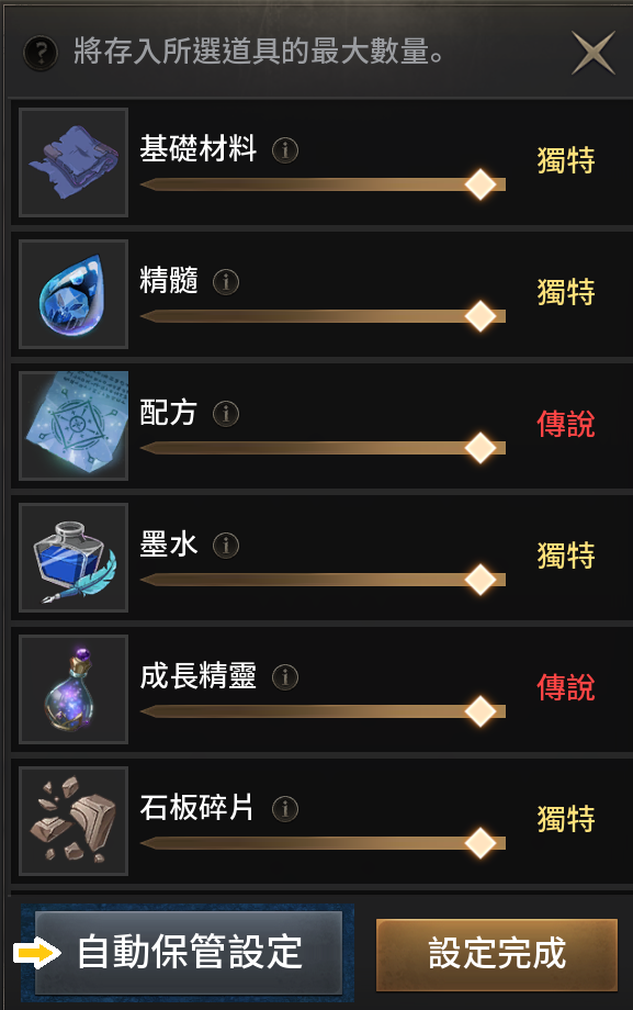 *可以設定「自動保管」,一鍵將所選種類的物品一次性存入倉庫,節省時間。背包重量超過69.9%會「負重」,一旦負重就會回不了魔,導致沒魔時技能無法施放。