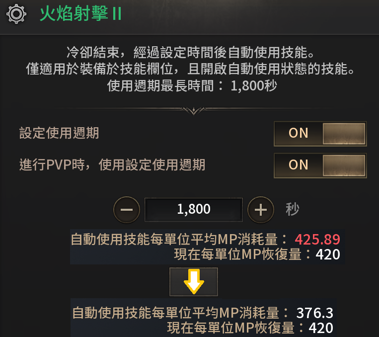 *如果MP恢復量低於消耗量,很容易過段時間角色就沒有MP。此時可以善用技能旁邊的齒輪,設定增加技能的冷卻時間,進而減少MP的消耗量達到技能常駐施放。