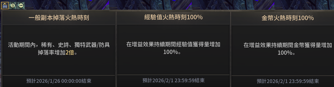 ·每月都會有的活動,可依參照上面的時程去掛機,有時候是經驗、金幣加倍,有時候是物品掉落量加倍。