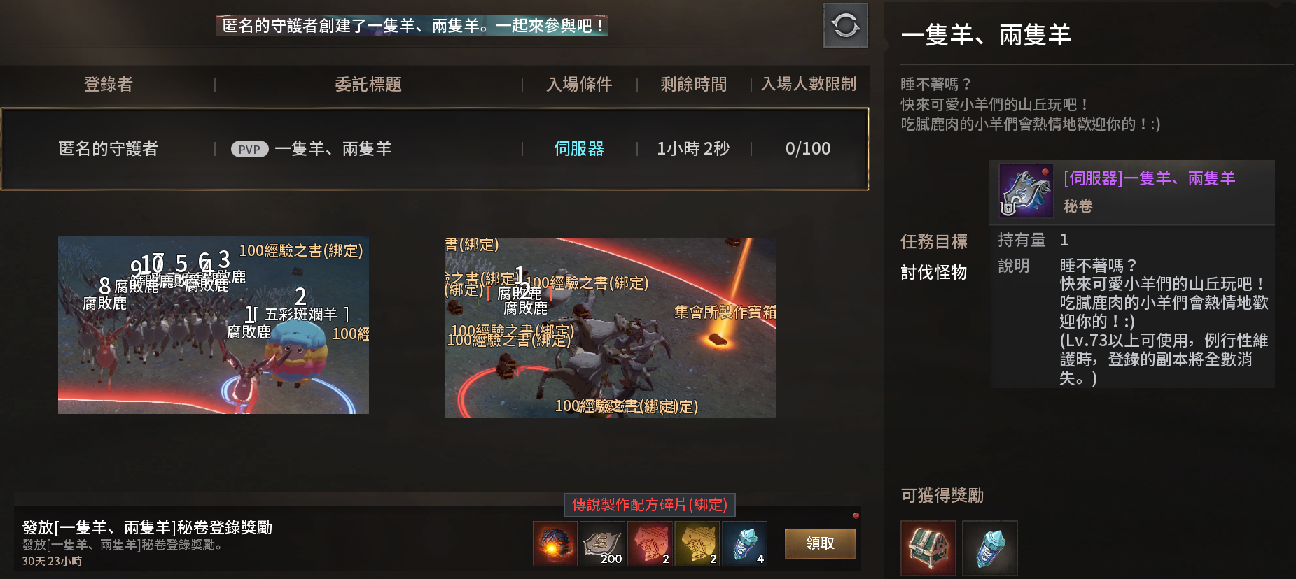 *此外,如果有人開「一隻羊、兩隻羊」 ,趕快進去狩獵,可以獲得很多經驗之書,運氣好還能獲得紅箱,紅箱也是紅武、紅配方的材料來源。